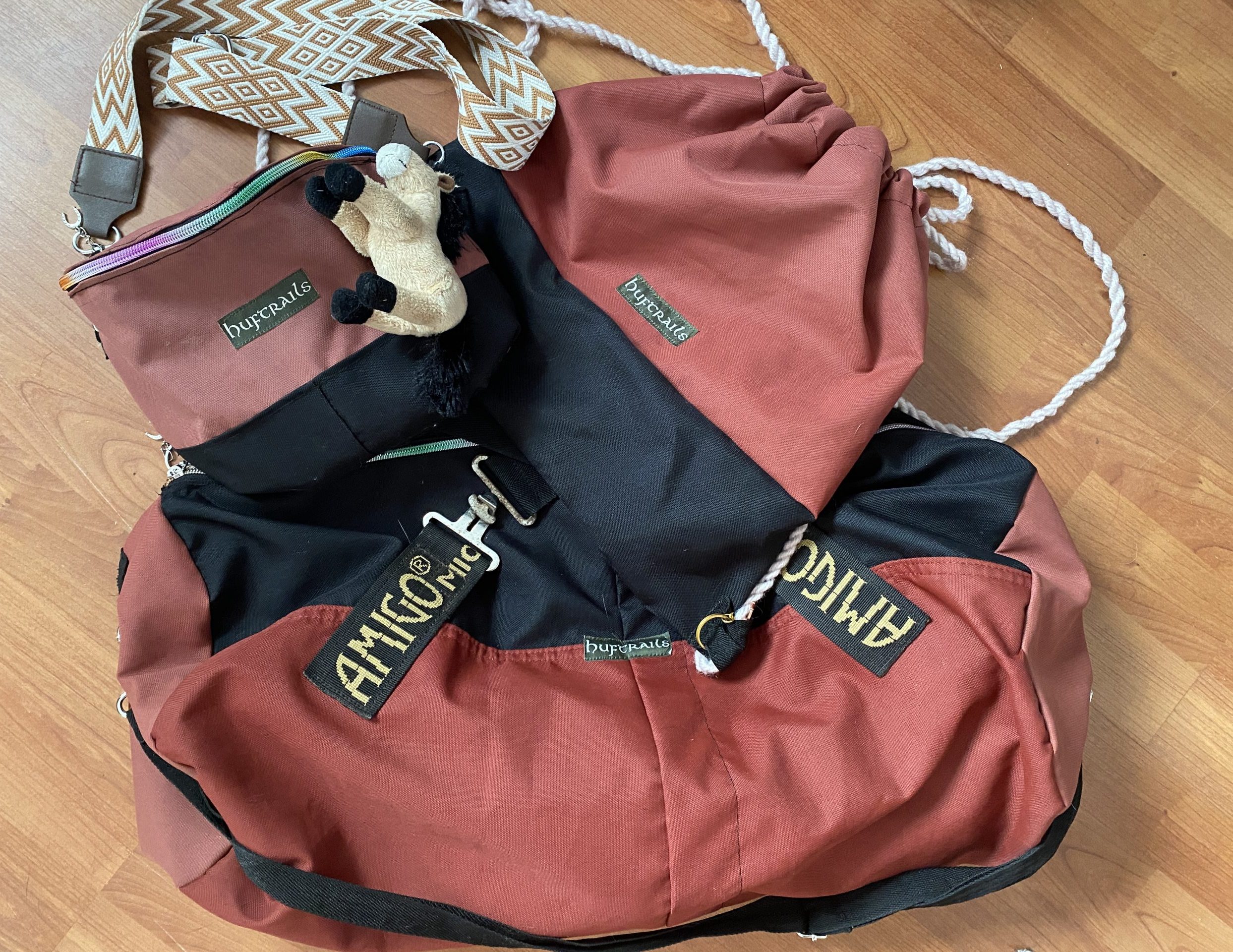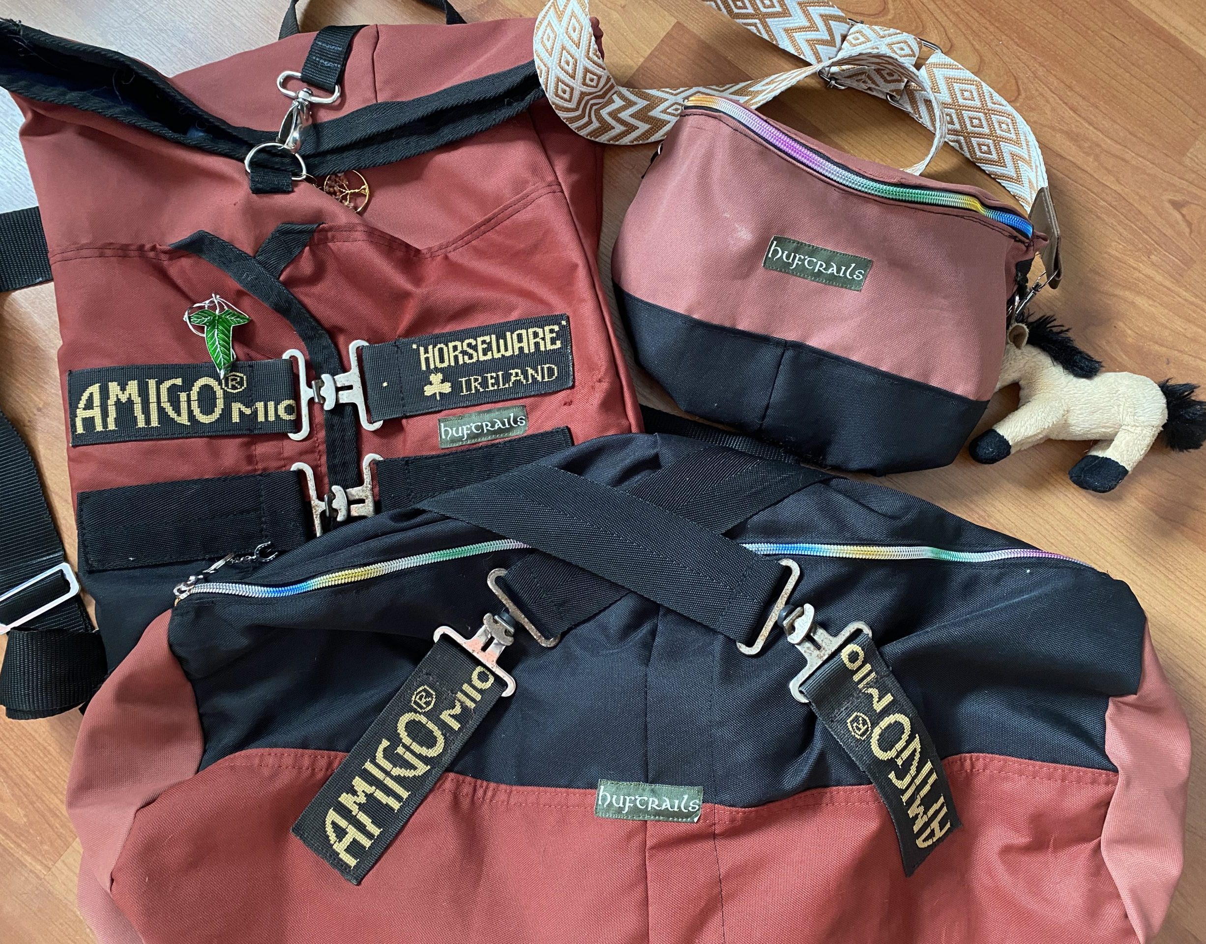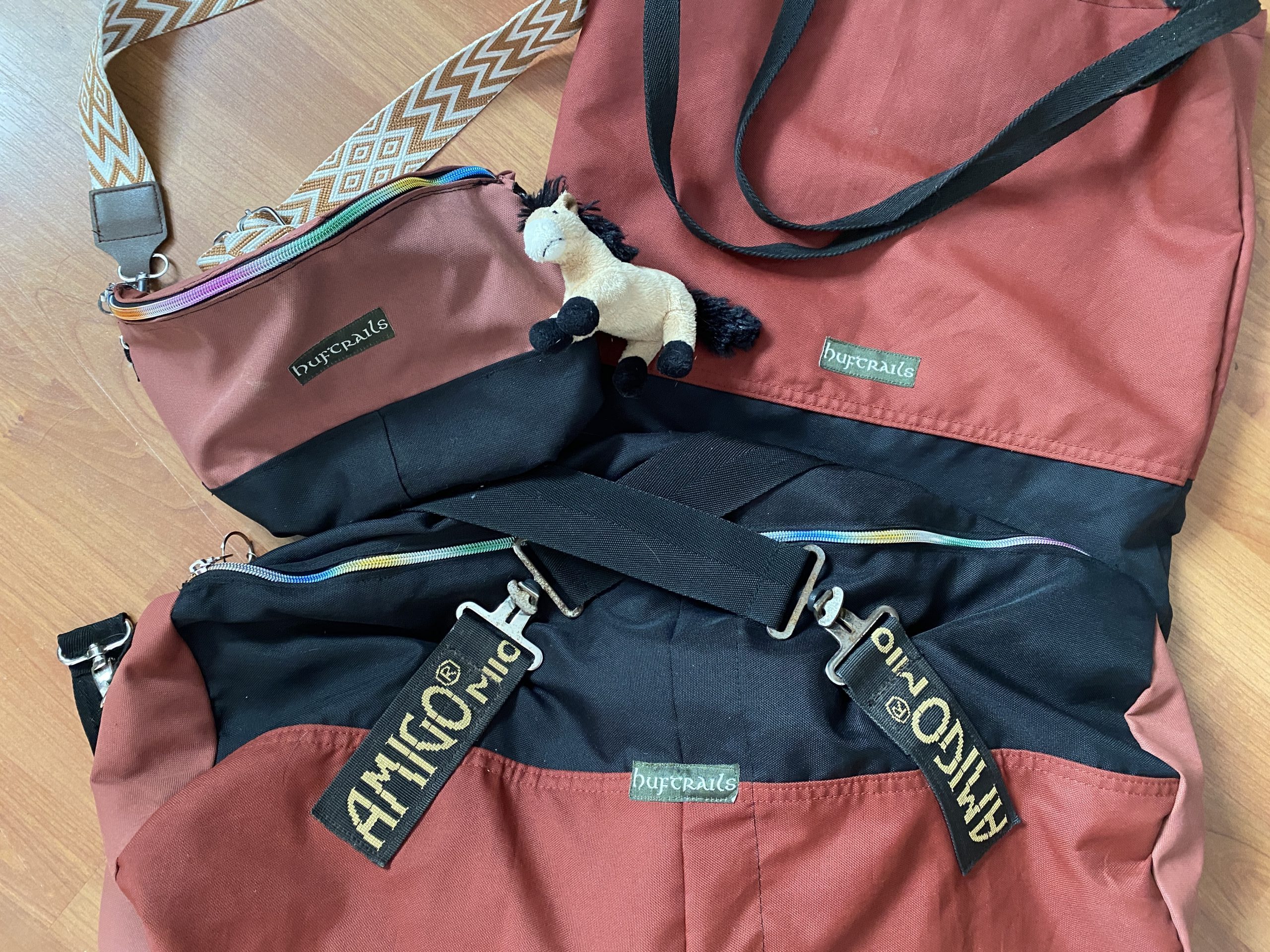 Dieses Set enthält drei Taschen, wie Rucksack, Sporttasche und Bauchtasche, die zusammen ein praktisches und liebevolles Ensemble bilden. Jede Tasche ist ein Unikat, gefertigt aus Materialien, die Geschichten tragen. Sie begleitet dich im Alltag, beim Training oder auf Reisen – ein emotionales Stück Verbindung zu deinem Pferd, das du überallhin mitnehmen kannst.