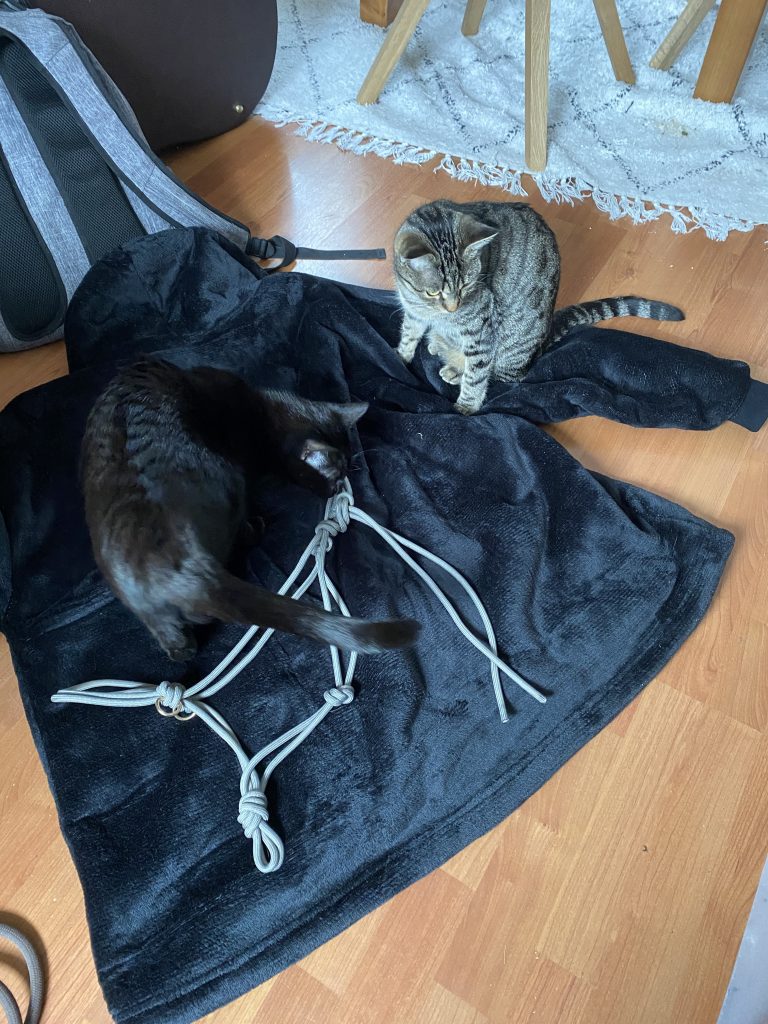 Bei HufTrails sind nicht nur liebevoll gefertigte Erinnerungsstücke am Werk – hier sorgen auch zwei ganz besondere Kolleginnen für Qualität und Wohlbefinden: Unsere Qualitätsmanagerin übernimmt mit beeindruckender Fachkompetenz (sprich: einem kritischen Schnüffeln an jedem Knotenhalfter) die strengste Qualitätskontrolle. Die Wohlfühlassistentin hingegen hat es sich zur Aufgabe gemacht, für maximale Gemütlichkeit zu sorgen – meistens, indem sie auf meiner Schulter einschläft, während ich arbeite. 🐱💤
